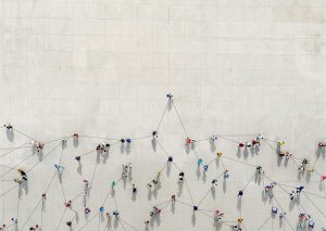 Crowd from above forming a growth graph with lines connecting between them to show how th COVID-19 can expand